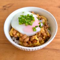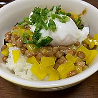 いつも同じになってしまいがちな納豆ご飯を、アレンジした一品です。 たくあんの食感とごま油の芳ばしさが納豆と合わさり、食欲をそそります。 とろ〜り温泉卵を崩して、よく全体を混ぜ合わせてお召し上がりください。