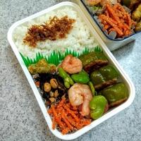 冷凍のそら豆を使いました。お弁当に入れたのでニンニクは控えましたが、塩味で美味しかったです。「優しい甘み にんじんのごま和え」も添えました。
