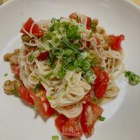 素麺ではなく、0.9mmのカッペリーニ、トマト、小粒納豆、ツナ缶で。簡単で美味しく、暑い日にさっぱり食べれて子供からも大好評だったので、また作ります。