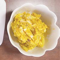 - 3 耐熱ボウルに1、2を入れて、ラップをかけ、600Wの電子レンジで5分ほど加熱します。フォークでなめらかになるまでつぶします。