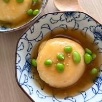 レンジで手軽に作れる上品な一品です。卵を溶いてレンチンするだけで、切り口の美しい茶碗蒸し風の料理に。生姜と白だしで作る繊細なあんかけは、優しい風味と食感が絶妙です。器に入れたまま少し冷ましてからサランラップで形を整えると、まん丸な仕上がりに。枝豆の緑が彩りのアクセントになり、ヘルシーな豆腐と組み合わせても美味しく楽しめます。