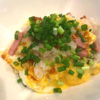 - 4 (B)を入れて混ぜたら溶き卵を回し入れ、卵が半熟状になるまで中火で熱し、火から下ろします。