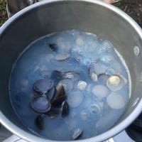 - 1 鍋に水、昆布、しじみ、料理酒を入れて弱火で加熱します。