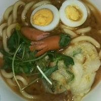 味噌とちょっとの醤油と砂糖での味つけの汁のうどんにしました😃 うどんのモチモチと汁が絡んで美味しい⤴( ☆∀☆)