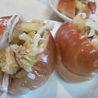 - 5 ロールパンに切り込みを入れて、4を挟みます。