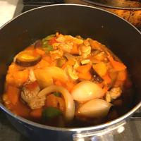野菜と肉を合わせ、ケチャップ大3、豆乳50cc、コンソメ1袋を入れ煮込む。