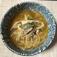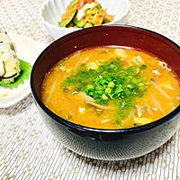 タンパク質が摂れるので主菜もちょっと兼ねている簡単美味しいお味噌汁です。顆粒昆布出汁加えてます。もやしと舞茸のおかげで食べ応えもあって結構お腹いっぱいになります。