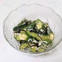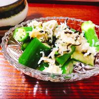 夏野菜のオクラときゅうりを和え物にしました。ごま油が香り、塩昆布としらす干しの塩味が絡みよく合います。シャキシャキの食感とオクラの粘り気もお楽しみいただけますよ。おつまみにもぴったりです。ぜひお試しください。