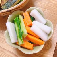 - 1 大根、にんじんは拍子木切りにします。きゅうりはヘタを取り、ピーラーで縦模様をつけ、拍子木切りにします。