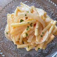 たらこの代わりに明太子で、新玉ねぎで作りました。玉ねぎと明太子がよく合って美味しかったです。