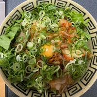 - 7 丼に5をよそい、2をのせ、6を盛り付けます。中央にキムチを乗せて少しくぼみを作り、卵黄を乗せ、小ねぎをかけたら完成です。