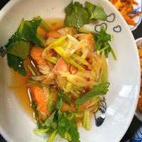 - 7 器に盛り付けて、三つ葉をちらして出来上がりです。
