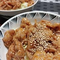 丼に白米を盛り、その上に粗く刻んだキャベツをレンチンして盛り、お肉を乗せました。