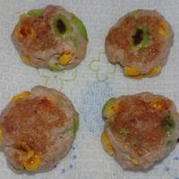 - 2 ボウルに豚ひき肉、1、コーン、(A)を入れ粘りが出るまでよく捏ね、6等分にし丸く成形します。