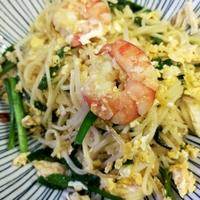 - 4 フライパンにサラダ油をひき、2と鷹の爪輪切りを入れ弱火で炒めます。香りが出たらエビ、もやし、1を入れて2分程中火で炒めます。