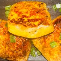 - 6 ごま油をひいたフライパンを熱し、こんがり焼いて刻みネギをちりばめたら出来上がりです。