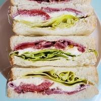 ロールパンに切り込みを入れる際は、中心にまっすぐ切り込みを入れるより、少し斜めに切り込みを入れると、パストラミロースやレタス等が挟みやすくなり、さらに綺麗に見えやすくなりますので、仕上がりもとても良くなります。