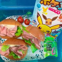パストラミがきれいに入れてないままランチボックスの中へ。時間が無いので、そのまま持たせました。