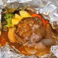 ハンバーグはフライパンで焼いて、野菜はレンチンしてからホイルで焼きました!
