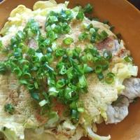 - 4 中火で熱したフライパンにサラダ油をひき、3を流し込み、豚バラ肉を乗せます。
