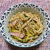 もやしの中華サラダのご紹介です。シャキシャキのもやしに手作り中華ドレッシングを和えた簡単な一品ですよ。もやしときゅうりの食感と、ロースハムの塩味がよく合い、クセになるおいしさです。お酒のおつまみにもおすすめです。