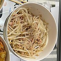 - 2 レンジから取り出したもやしに、(A)の調味料と油を切ったツナを混ぜ合わせます。