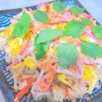 混ぜ合わせることで、ごはんに味が染みこみ、おいしく仕上がります。 今回は市販の錦糸卵を使用しております。 カニカマや、いくらを使用する事で面倒な工程もなく華やかになりますよ。 いくらの代用品としてとびっこや桜でんぶで代用もできます。