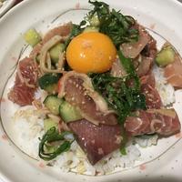 スーパーの刺身盛り合わせで作りました。簡単過ぎ👌 きゅうりとカニかまはなかったけど、めちゃめちゃ旨い‼️ ゴマ油の香りが食欲をそそります😋 卵なしでもタレが美味しいので問題ないと思います。リピ決定。