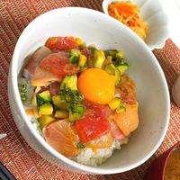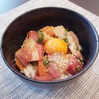 切って和えて乗せるだけ❗ 火も使わず5分でできてめちゃ旨😋 スーパーの刺身盛合せを買ってくればあっという間に豪華な丼の出来上がりです。