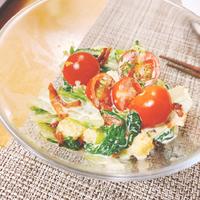 - 2 トマトのヘタを取り除き、1cm角の角切りにします。