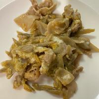 - 2 豚バラ肉は食べやすい大きさに切ります。