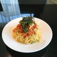 納豆とキムチの組み合わせはとてもよく合いますね。納豆スパゲティはよくありますが、キムチを入れることによって、程よい辛さ、風味、食感の加わったひと味違うスパゲティに仕上がりました。納豆とキムチはスパゲティと一緒に炒め合わせずに、後からのせるのがポイントです。