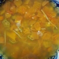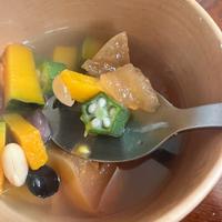 ミックスビーンズは水煮が売ってなかったのでドライタイプ、オクラとカボチャは冷凍物、家にあったトマトが小さかったので余っていた冷凍ミックスベジタブルと豆苗を入れました。具沢山の汁物があるとおかずが少なくても満足できます。