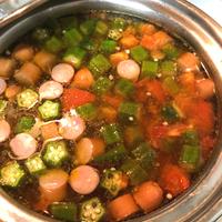 具材は余るのも面倒だったのでフジッコの蒸しサラダ豆2袋とオクラは8本(1袋)全部投入。