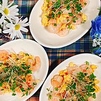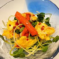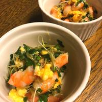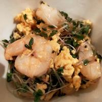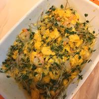 ふんわりとした炒り卵と、ぷりぷりしたエビ、ブロッコリースプラウトをスイートチリソースで味付けをして和えました。ブロッコリースプラウトの緑色とエビの赤、炒り卵の黄色がとても綺麗で、色鮮やかな一品ですよ。
