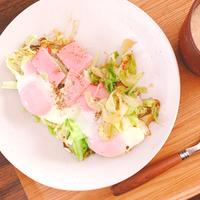 - 3 フライパンにサラダ油を入れて中火に熱し、1のキャベツ、ハム、2の順に入れ、塩こしょうを振ります。