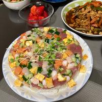 具は自分の好みでマグロ サーモン ホタテ エビ きゅうり 卵で作りました。鶏そぼろもアクセントになって良かったです♪