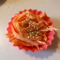 - 1 にんじんは長さ5cmほどの細切りにします。