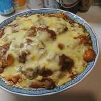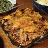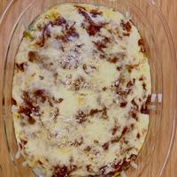 - 6 デミグラスソース缶を全体に敷き詰め、ピザ用チーズ、パン粉をかけて180℃のオーブンで15分加熱します。