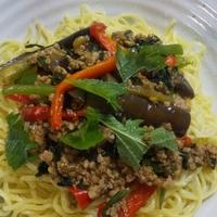 立て続けのたべれぽでリピしてます❗️塩、胡椒入れずオイスターソースと砂糖を気持ち多めに、チリペッパーも少々加えて大葉を散らしました❗️食材はナス、パプリカ、ニラです😋😺お店の味です🍴
