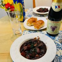 - 7 鍋を中火で加熱し、赤ワイン400ml、水、6を入れます。沸騰したらアクを取り除き、蓋をして中火で1時間ほど煮こみます。途中、水分量が少なくなったら水または赤ワインを足します。