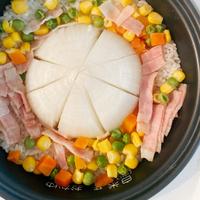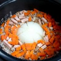 ベーコンがなかったのでハムで。バターは炊き上がり後に投入。たべれぽを参考に人参を追加。