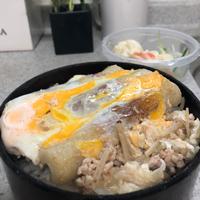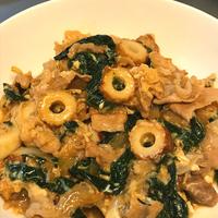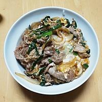 - 2 フライパンに(A)とたまねぎを入れます。玉ねぎに火が通ったら豚バラを入れ色が変わったらちくわ、ニラを入れます。お肉に火が通りニラがしんなりしたら溶いた卵回し入れ軽く混ぜご飯の上に乗せ一味かけて完成です。