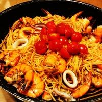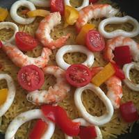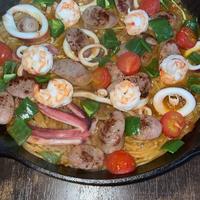 いろんな魚介類ソーセージなど加えて旨味をたっぷり吸ったパスタがめちゃくちゃ美味しかったです。米で作るパエリアより好きかも♫