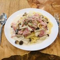 たっぷりのきのこを入れて、クリームスパゲティにしてみました。きのこの歯応えと旨味が、クリームソースとよく合います。お好みの肉を入れるとボリュームある一品に仕上がります。お好みのきのこを入れて、是非お試しくださいね。