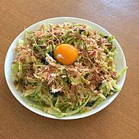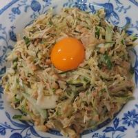 キャベツと納豆の意外な組み合わせが生み出す新食感のサラダです。シャキシャキのキャベツに納豆のネバネバ、かつお節の風味が絶妙にマッチ。温泉卵をのせると、とろ~りまろやかな味わいに。マヨネーズとめんつゆのコク深いソースに、ピリッと効いたラー油がアクセントに。野菜をたっぷり摂取できる上、作り方も簡単。お酒のおつまみやご飯のおかず、うどんの薬味としても楽しめます。