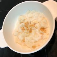 - 2 耐熱容器に1と牛乳を入れ、ふんわりとラップをかけ、500Wの電子レンジで30秒程加熱します。