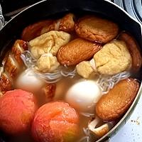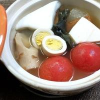 - 1 鍋に煮汁の材料、昆布を入れて中火にかけます。沸騰してきたらさつま揚げ、結びしらたき、ゆで卵、トマトを入れ、蓋をして弱火で5分ほど煮込み、火から下ろします。