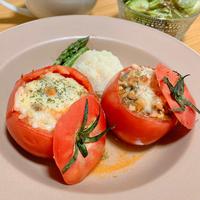 鶏ひき肉と玉ねぎ、しいたけ、人参などの具材を炒めて詰めるだけの手軽さが魅力です。トマトの酸味と具材の相性が抜群で、ジューシーな食感がたまりません。チーズをたっぷり入れて焼くと、より一層美味しさがアップ。余った具材は丼やパスタのアレンジにも使えて便利です。トマトが苦手な方でも美味しく食べられると好評で、見た目も可愛らしい一品に仕上がります。