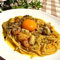 シーフードミックスと、トッピングに卵黄も追加してみた◎